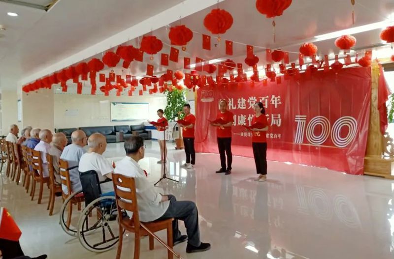 充分发挥老党员的榜样力量,后勤党支部党员走进老年人养护中心,为入住的老党员佩戴大红花,并通过合唱、朗诵、讲革命故事等形式,与老党员们一起追寻红色足迹,歌颂党的光辉历程。在学习榜样精神中,汲取前进力量,激发干事创业热情。